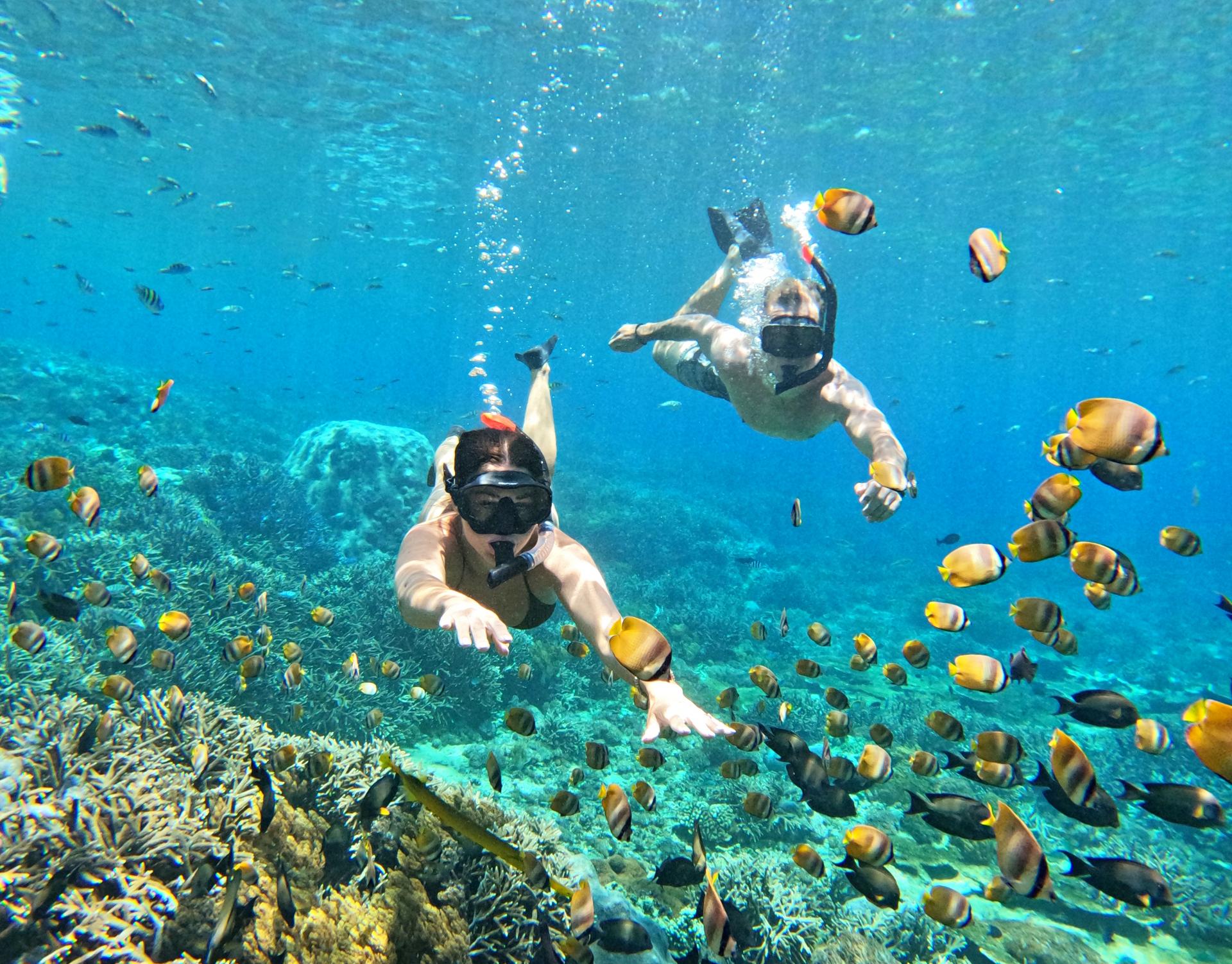시원한 바다에서 물장구치며 물고기들과 놀고, 만타베이에서는 가오리들과 함께 수영도 가능합니다.