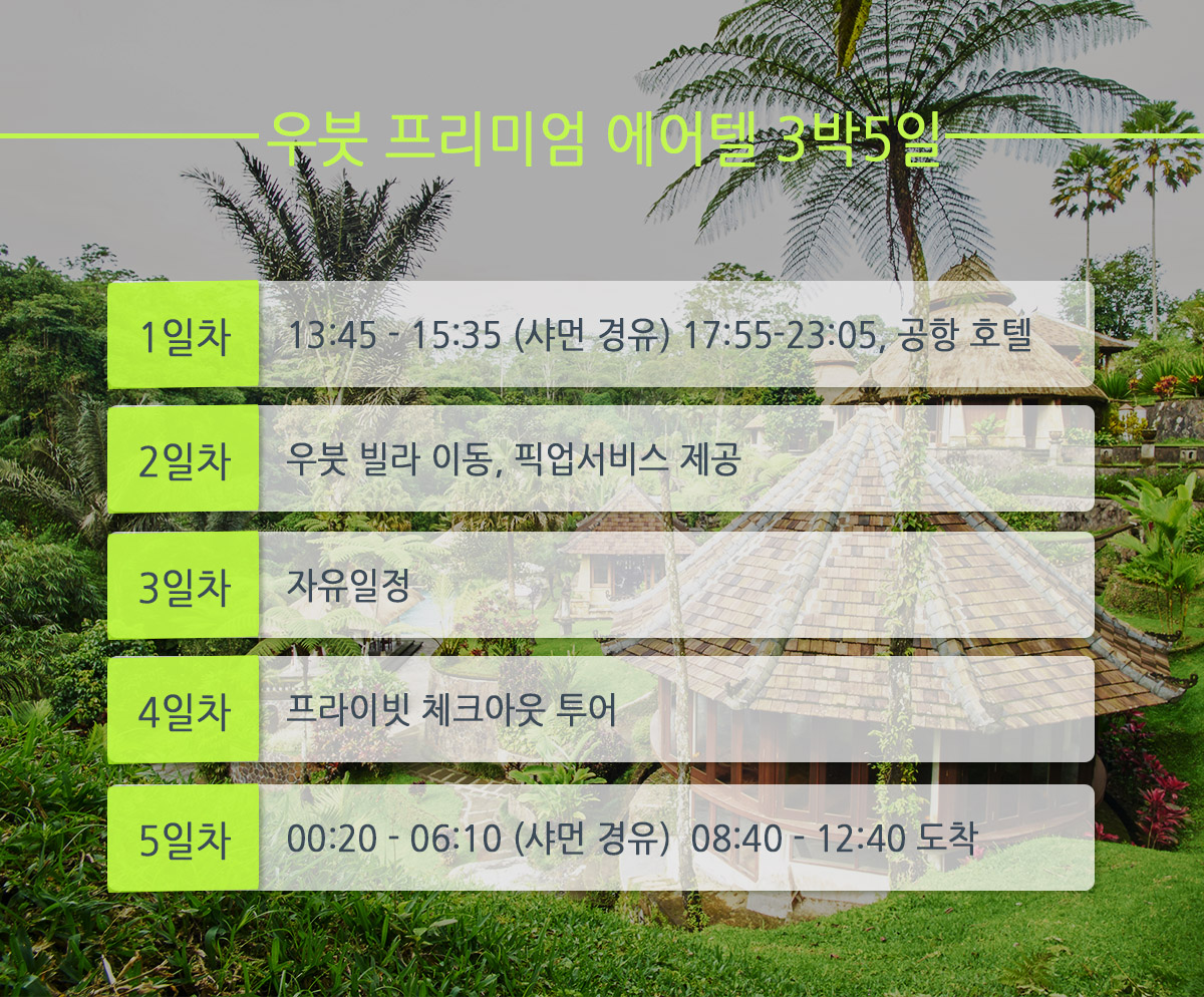 - 본 상품은 2인 기준의 우붓 프리미엄 에어텔 상품입니다. 안내된 가격은 1인 요금입니다.