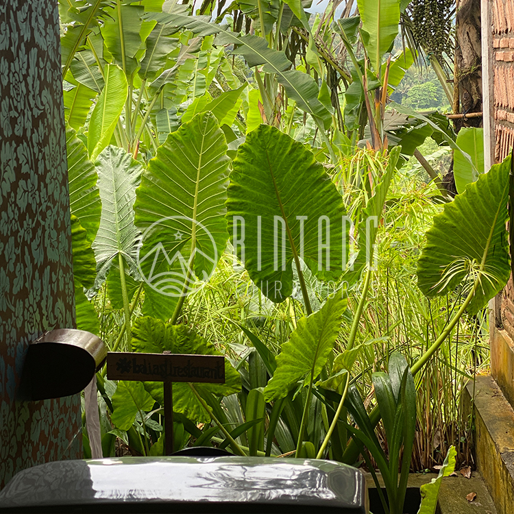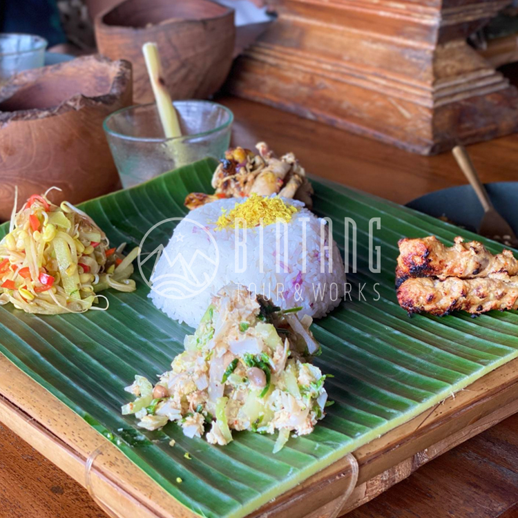 You enjoy lunch at a local Indonesian restaurant. The main menu is Nasi Campur, which you can order with your choice of side dishes. The view of the restaurant is beautiful and photogenic, and the restrooms are especially impressive, with no boundaries to the outside world.